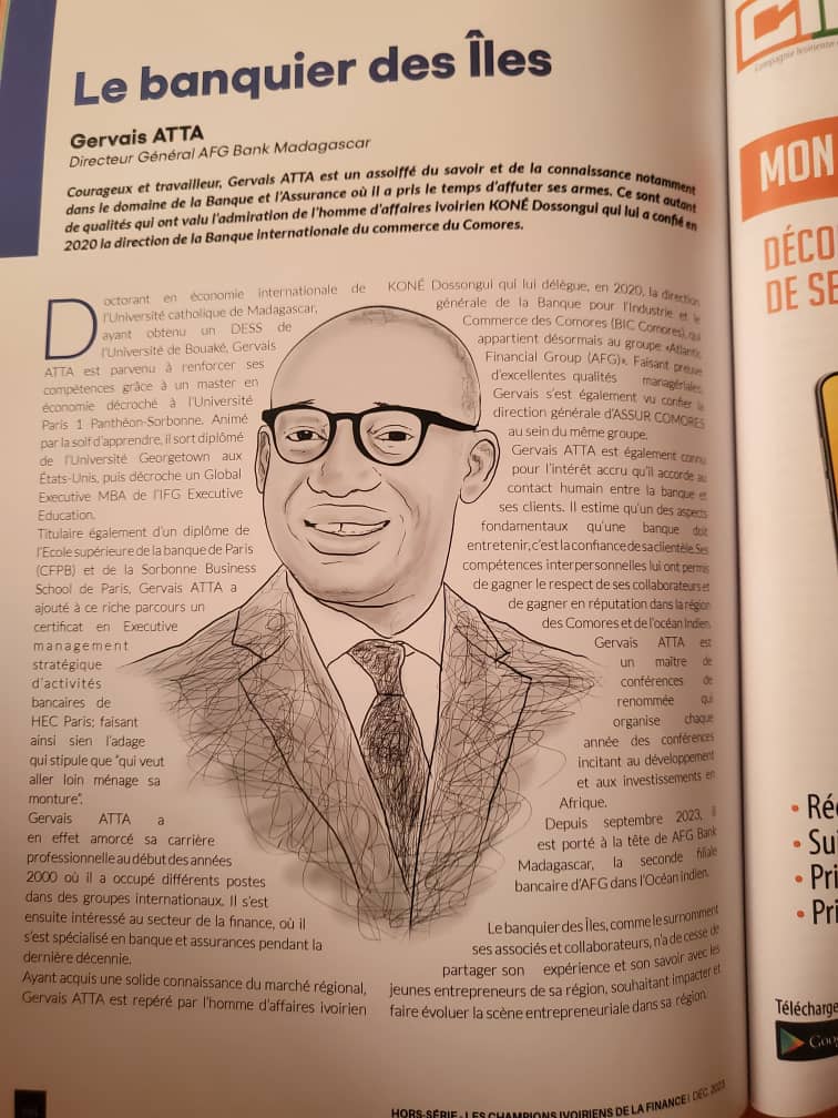 Dr. Gervais Atta began his notable career as the CEO of AFG Bank of Madagascar. Then, since 2023, he officially holds the position of International Development Director at AFG ATLANTIC GROUP S.A. Bank - Indian Ocean, a leading financial institution operating in the Indian Ocean region. Under the auspices of the group's executive committee, he spearheads the coordination and supervision of group development projects, encompassing banking, insurance, microfinance, and industry sectors. Additionally, he oversees relationships with partners, consultants, regulatory bodies, administrative authorities, and political entities.