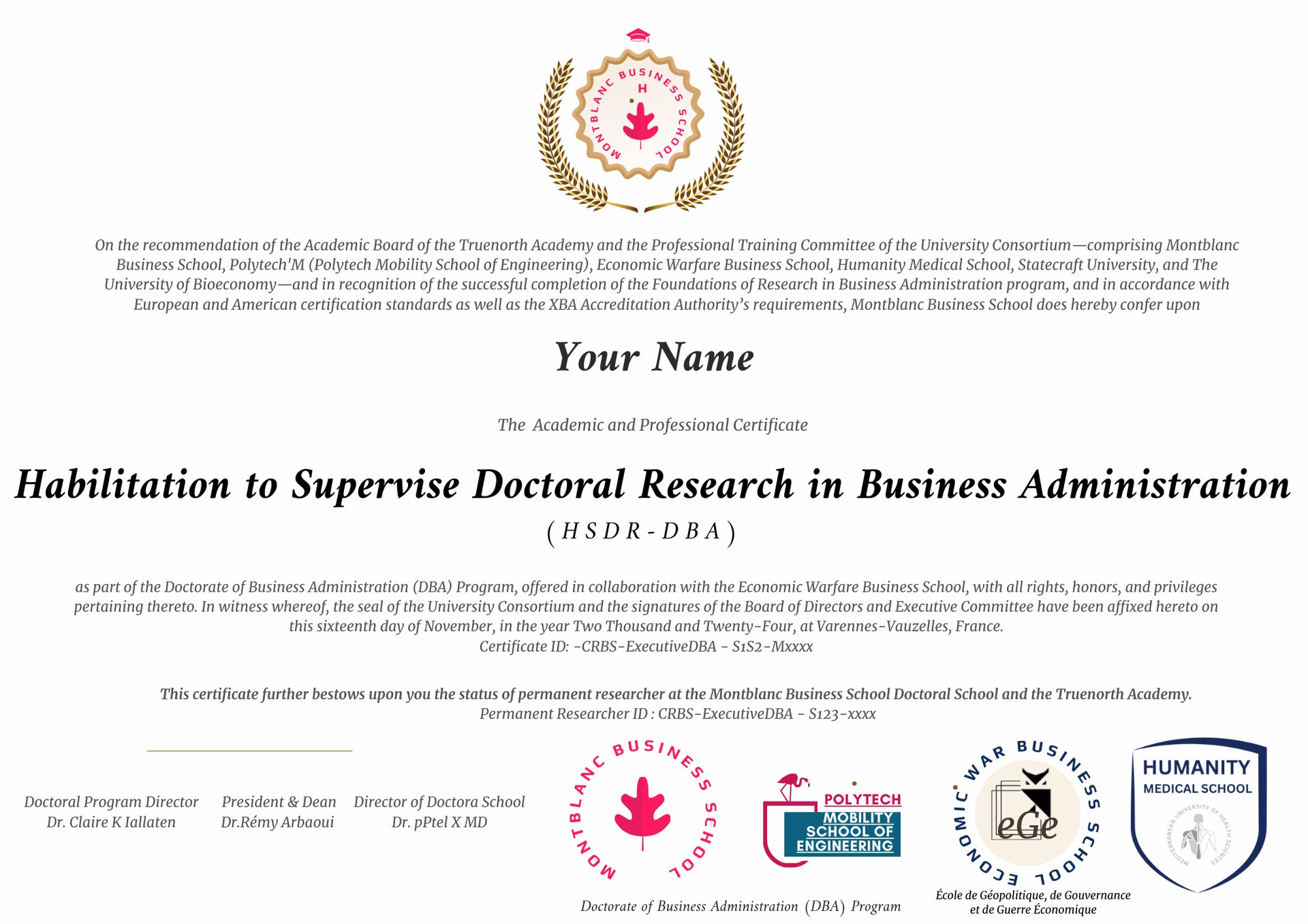 The Habilitation to Supervise Doctoral Research in Business Administration is the highest level of academic certification, empowering candidates to supervise doctoral research and lead large-scale academic projects. This certificate demonstrates advanced academic leadership and the ability to guide doctoral students toward producing groundbreaking research.