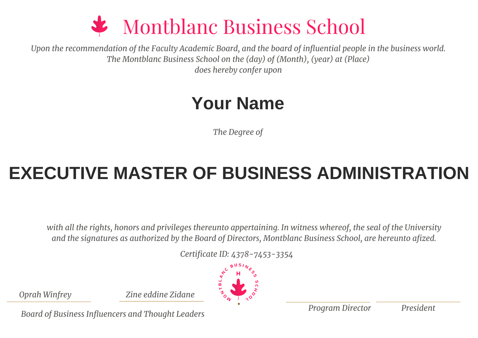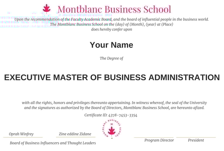 All degrees, certificates and honorary awards issued by the Montblanc Business School are verifiable through our free online certificate verification portal. Certificate Verification Portal.
